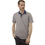 - Short sleeve yarn dye striped polo with a denim collar and inside placket