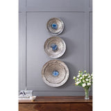 Transform bare wall spaces into stunning focal points with the Dex wall decor set. These gorgeous pieces feature aluminum discs in a metallic silver finish with an abstract radial design and agate centerpieces in multiple hues of blue, blending well with a variety of styles and color schemes. Mounting hardware is concealed at the back for a finished presentation