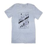 Our Slope Tee in ice blue is a screen printed t shirt with black water-based ink. With a retail fit, this incredibly soft t shirt is made out of a tri-blend of 50% polyester, 25% cotton, and 25% rayon. Our soft mens t shirts are unisex in wear.