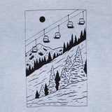 This shirt is part of our Winter Collection. The design celebrates mountain culture with the winter sport of skiing. This simple design includes ski lifts going up and down the mountain and being able to see the tree line.