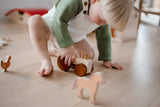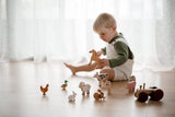 Looking for a super cute animal set? Our wooden animal set includes a tractor along with a cow, a duck, a sheep, a horse, a donkey, a pig, a chicken, a turkey, a goat and a rabbit. This set goes perfectly with our wooden barn house to create a farm play set. Introduce children to this play set which will promote the development of childrens imaginative skills as they engage in pretend play.